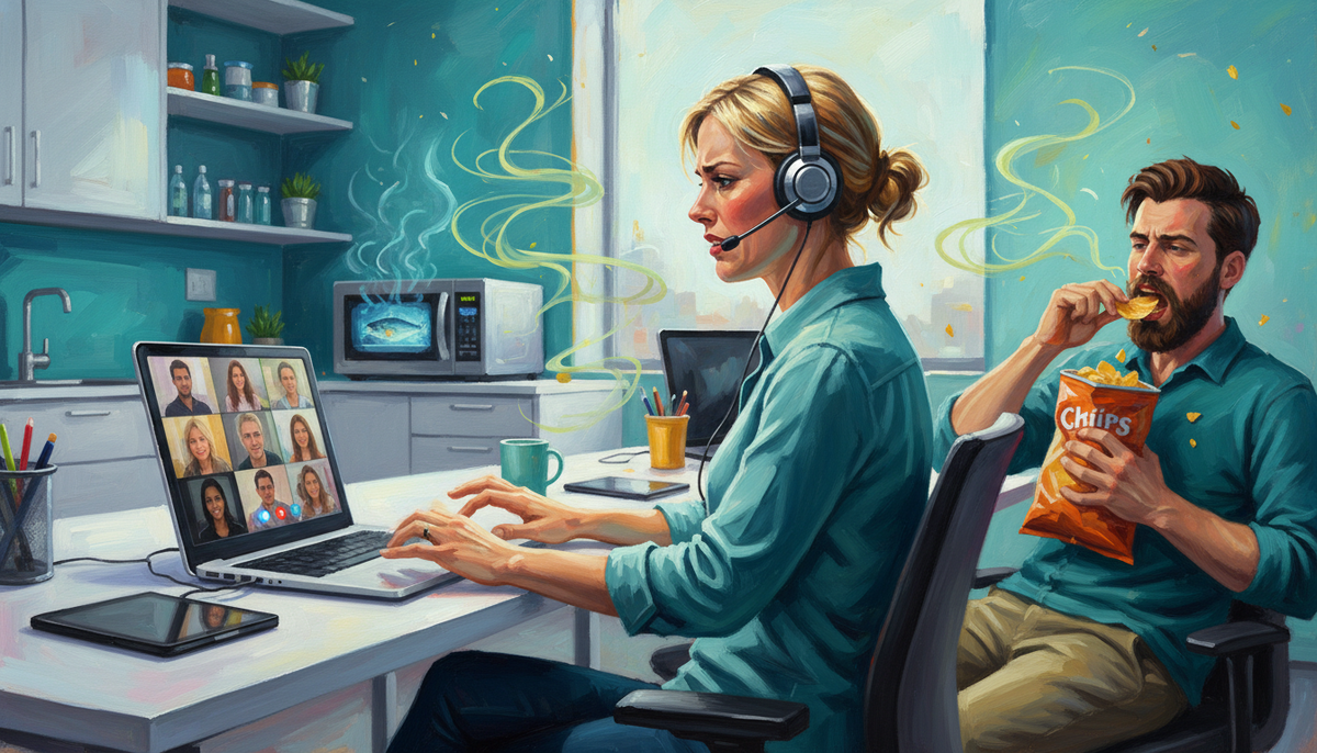Когда мы едим за столом, микрофон может передать каждый звук, а запахи — задержаться надолго. Простое правило, которое работает в большинстве команд: камера включена — отложи вилку. Небольшие компромиссы, например нейтральные перекусы или предупреждение перед началом звонка, помогают держать фокус на работе и на коллегах вокруг.