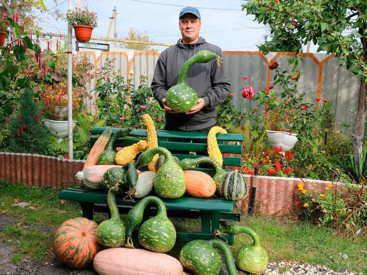 Тыква «Лагенария» уникальна: по мере созревания ее кожура становится твердой, а мякоть высыхает. Это делает ее идеальным выбором для создания различных декоративных элементов или даже сосудов. Юрий не только радует своих соседей необычными овощами, но и демонстрирует, как можно украсить жизнь с помощью нестандартных решений в огороде.