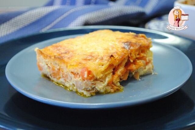 4. Сборка блюда. На дно жаропрочной формы выкладываются кусочки рыбы, затем слой обжаренных овощей и в завершение — равномерная заливка.