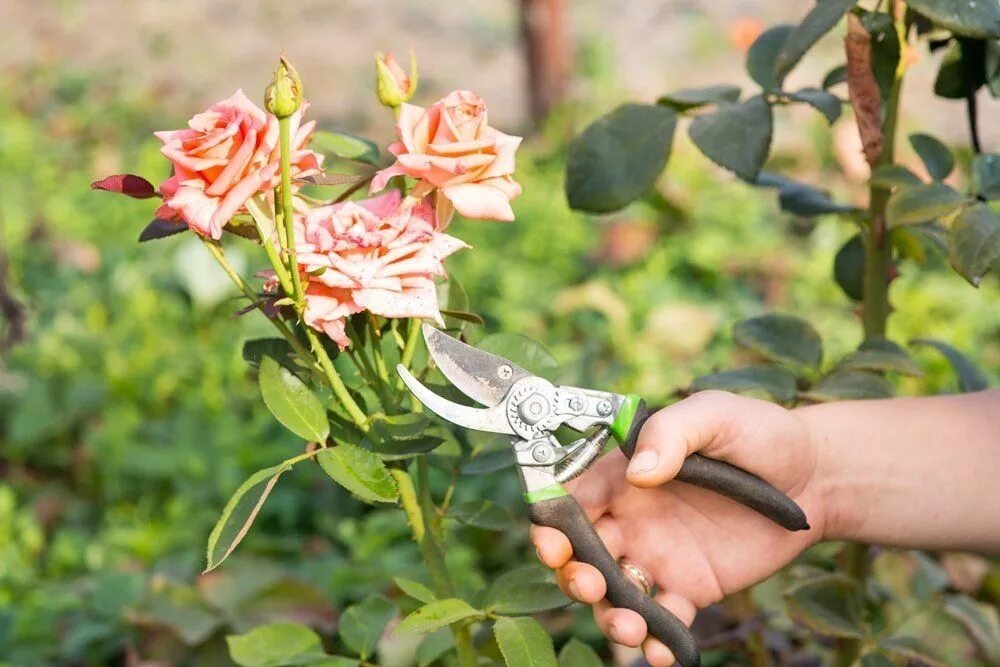 - Чайно-гибридные розы: Удаление увядших соцветий производится вручную, а после завершения цветения срезается побег на треть его длины, сверху оставляя несколько важных листьев.