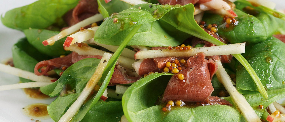 - Ингредиенты: 120 г копченой утиным грудки, 120 г шпината, 160 г яблок сорта «Фуджи», 4 ст. ложки оливкового масла, 4 ч. ложки зернистой горчицы, 2 ч. ложки меда, 4 ст. ложки бальзамического соуса, 28 г кедровых орехов, соль и перец по вкусу.