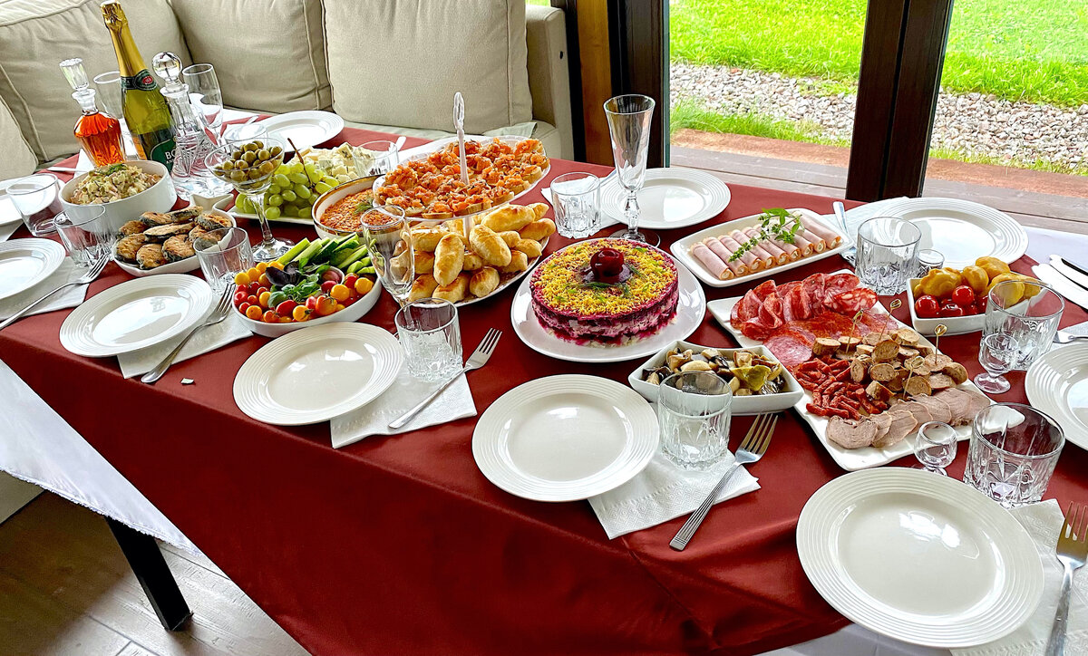 Также на столе присутствовали колбасы, домашние маринованные грибы, бутерброды с красной рыбой, пирожки с капустой и жареная горбуша. Не обошлось и без любимого салата "Оливье", который особенно порадует свекровь и племянника.