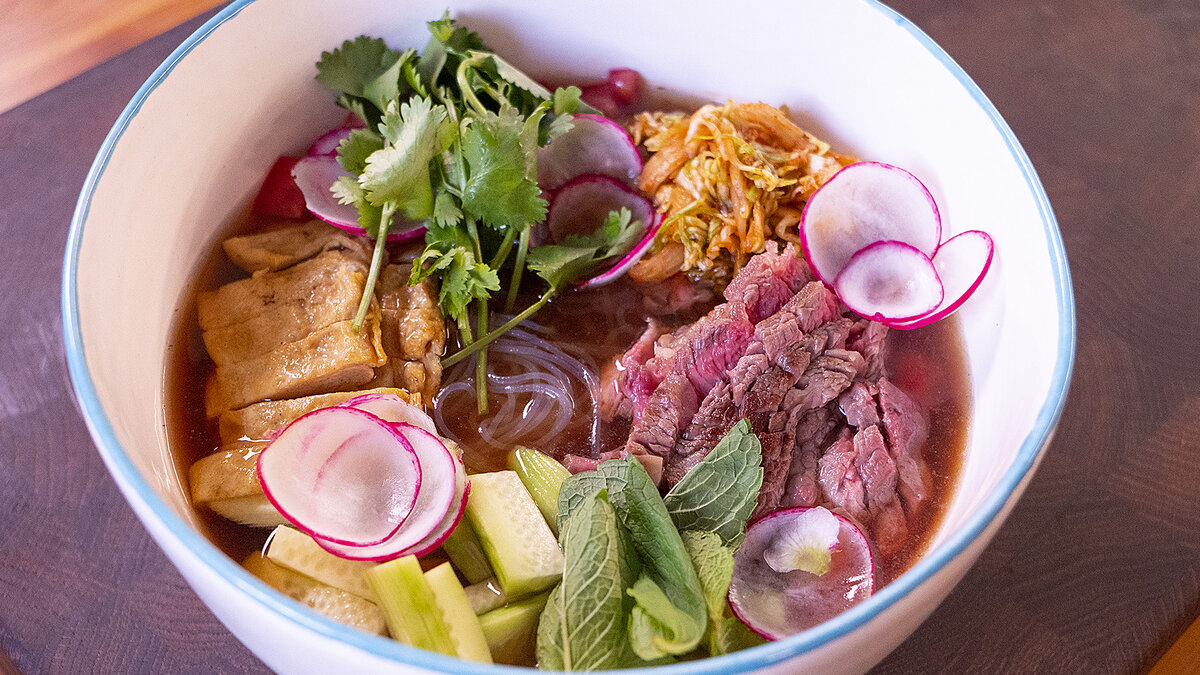 4. Для сервировки в глубокую тарелку выложить фунчозу, мясо, омлет, капусту с сельдереем, а затем добавить огурцы, томаты и редис. Залить процеженным бульоном и украсить зеленью. Блюдо готово к подаче! Приятного аппетита!