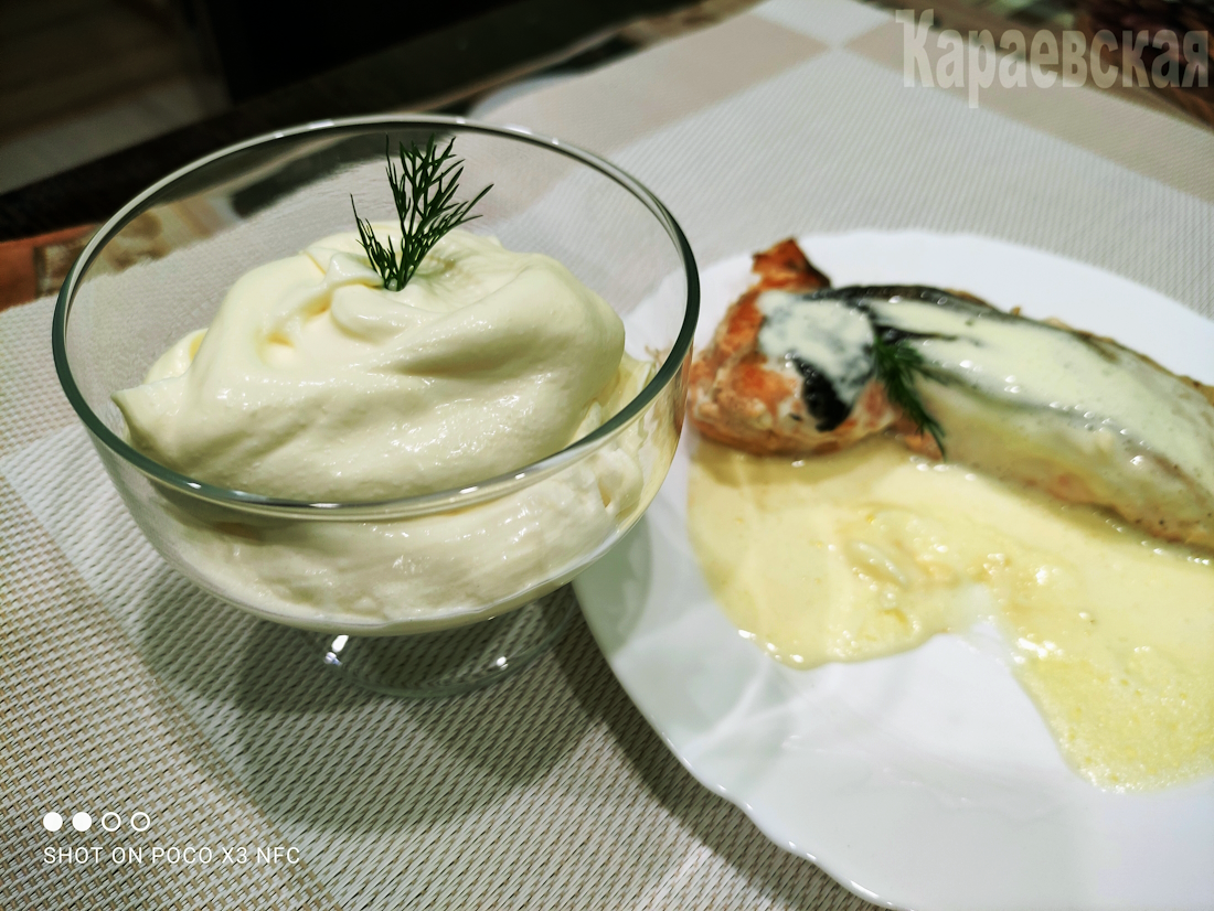 Погружной блендер разместите над яйцом и начните взбивать его, не поднимая блендер. Постепенно, тонкой струйкой влейте растопленное сливочное масло. Как только масса начнёт светлеть и загустевать, можно поднять блендер, чтобы масло лучше смешивалось с яйцом. Конечная текстура соуса должна напоминать сметану — это идеальное состояние!