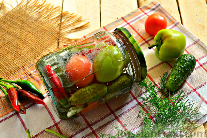 Если вы собираетесь в компании или просто хотите заготовить много закусок сразу, то стоит обратить внимание на рецепт маринованного овощного ассорти. В нём собраны все любимые овощи: помидоры, огурцы, кабачки, болгарский перец и морковь. Заготовка делается в удобной трехлитровой банке, что обеспечит достаточное количество для всех.