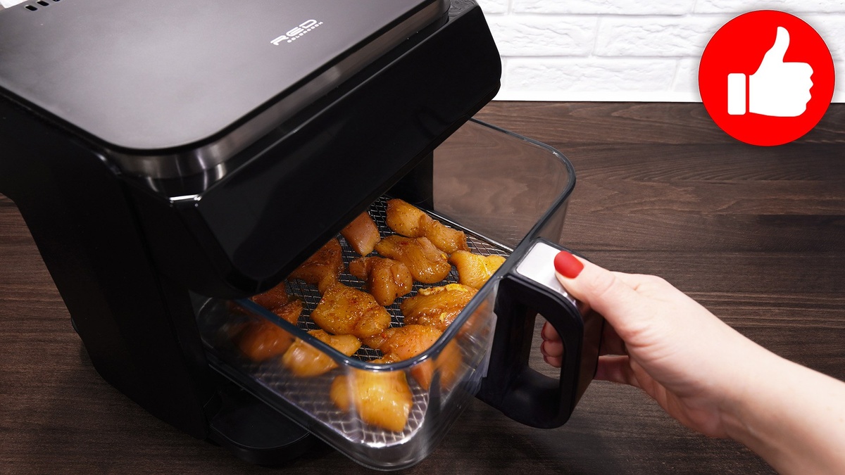 После того как курица замариновалась, выкладывайте её на нижнюю решетку аэрогриля в один слой, не смазывая решётку никакими маслами. Готовьте на режиме «Мультиповар» при температуре 190°C в течение 16 минут для первой партии. Учтите, что для последующей партии время приготовления можно уменьшить до 14 минут, так как аэрогриль уже будет нагрет.