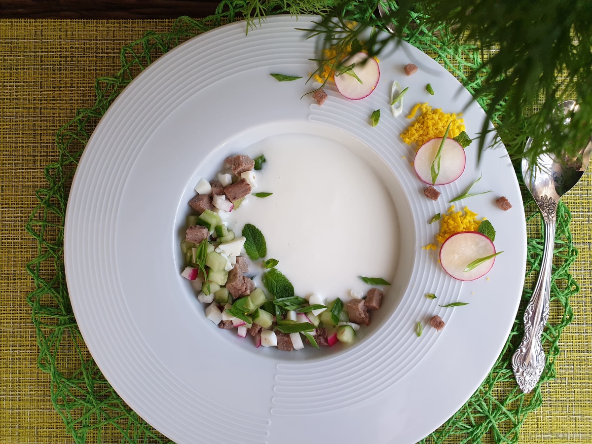 Смешиваем все подготовленные продукты, а затем следует красиво оформить подачу. Окрошку выкладывают на одну сторону тарелки, аккуратно вливается кефир, затем блюда подсоливаются и перчатся по вкусу, добавляется зелень для украшения.