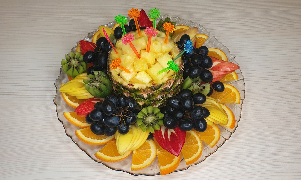 Эта фруктовая нарезка не только порадует глаз, но и станет вкусным и полезным десертом на новогоднем столе. Гости точно оценят вашу креативность и станут делать комплименты.
