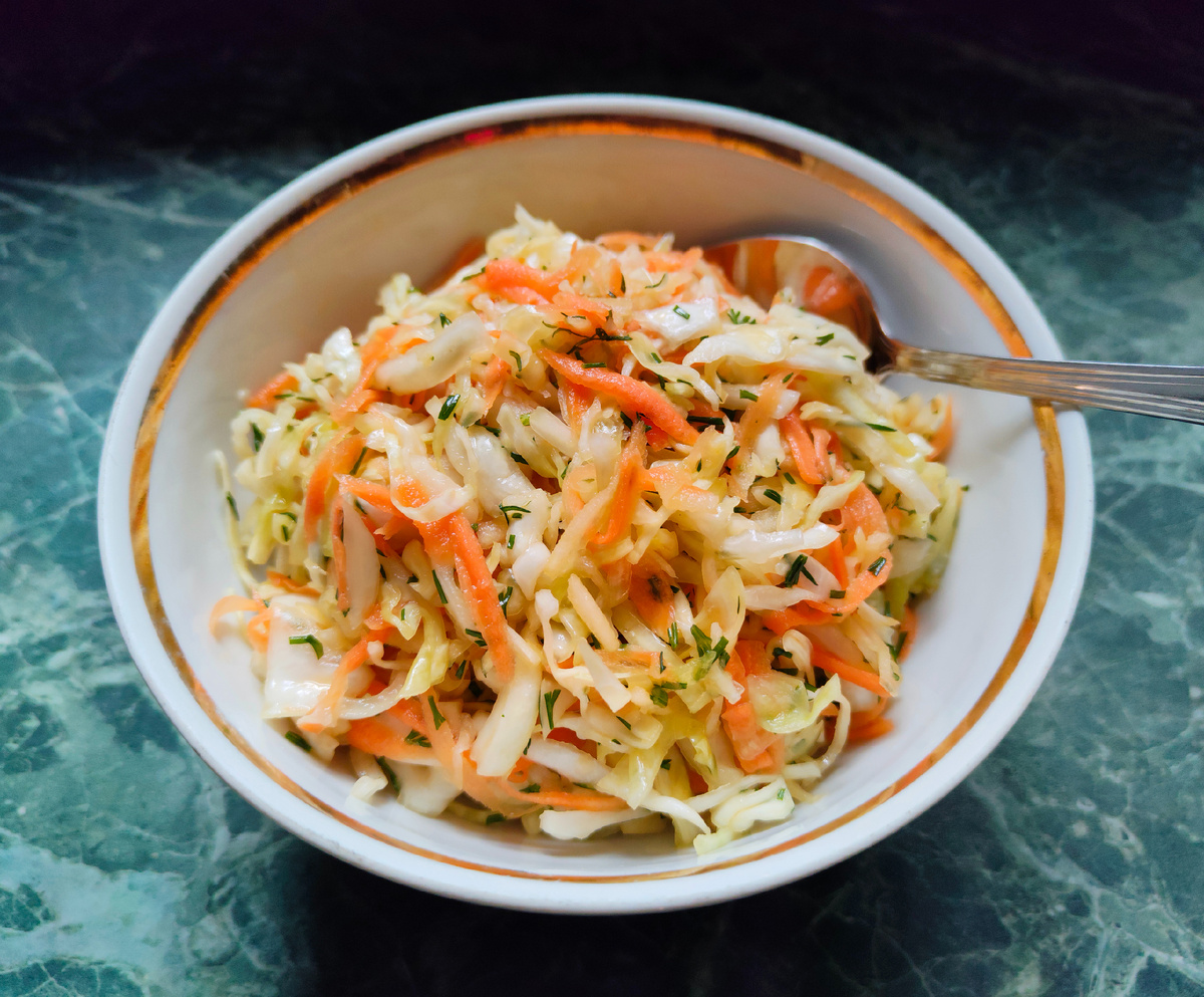 Начните с мелкой шинковки капусты. Затем натрите на крупной тёрке морковь и очищенное яблоко. При желании добавьте измельчённую зелень, например, укроп.