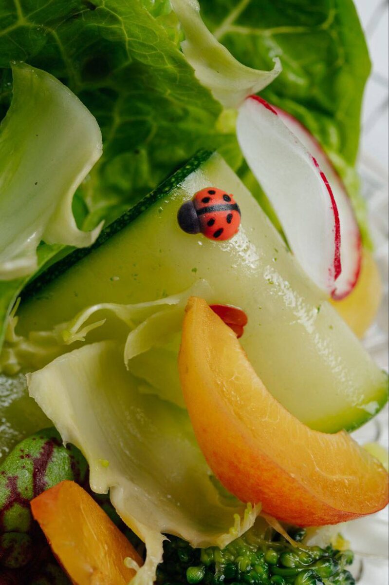 Салат, несмотря на свою простоту, отражает сложный баланс вкусов и сезонность продуктов. Шиповник, используемый в заправке, привносил не кислотную, а нежную северную ноту, которая отличает блюда Twins Garden. Он идеально дополнял свежие овощи, подчеркивая их натуральный характер и не заглушая их аромат.