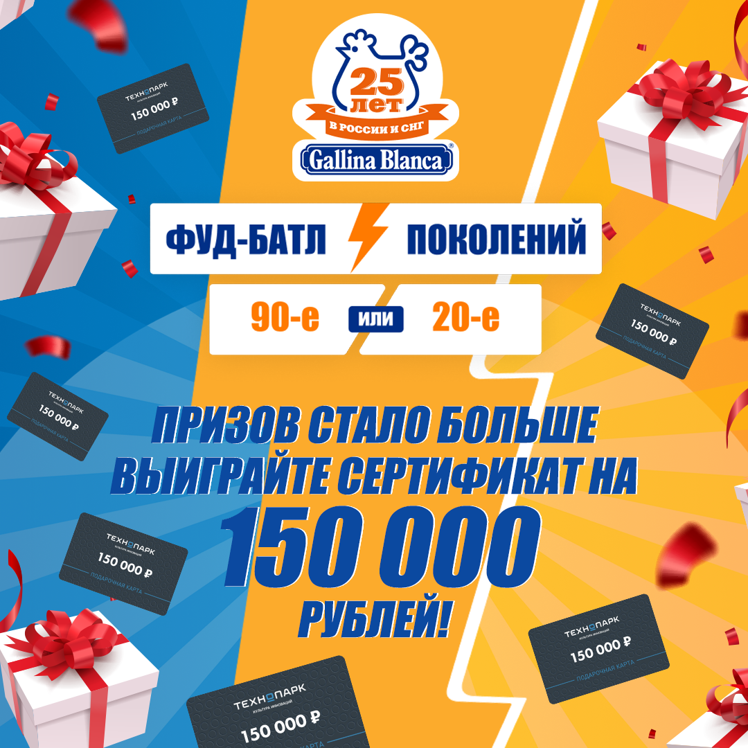 Помимо голосования, организован творческий конкурс: готовьте блюда по рецептам блогеров, фотографируйте результаты и загружайте в систему. Победители получат специальные призы от Gallina Blanca, такие как наборы посуды и продукцию бренда. Главный приз за наилучшую фотографию — сертификат на покупку бытовой техники на сумму 150 000 рублей в магазинах Технопарк.
