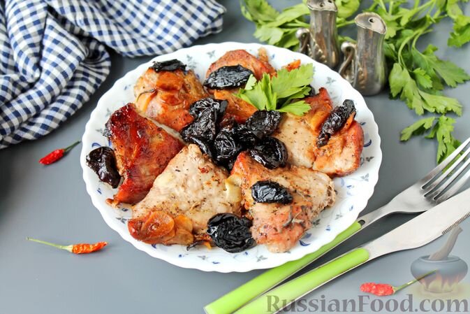 - Свинина с черносливом и чесноком: запечённая в духовке, сочная и ароматная, станет звездой вашего стола. Мясо маринуется в сочетании с пряными травами, что придаёт ему особую изюминку.