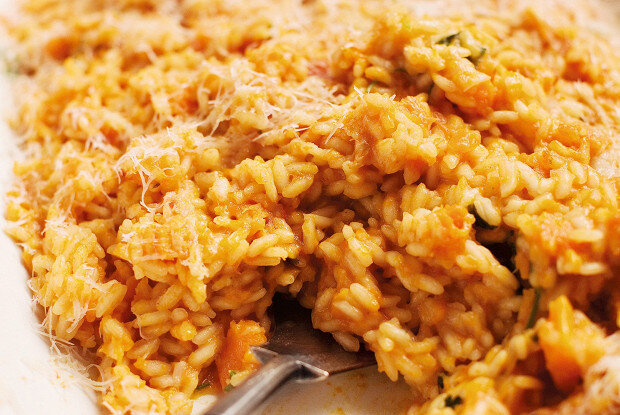 1. В глубокой сковороде растопить сливочное масло и обжарить нарезанный мелко лук-шалот. Как только лук станет мягким, добавить измельченный чеснок и готовить еще одну минуту. Затем влить нарезанную кубиками тыкву, тщательно перемешать и жарить на быстром огне около десяти минут, не забывая помешивать.