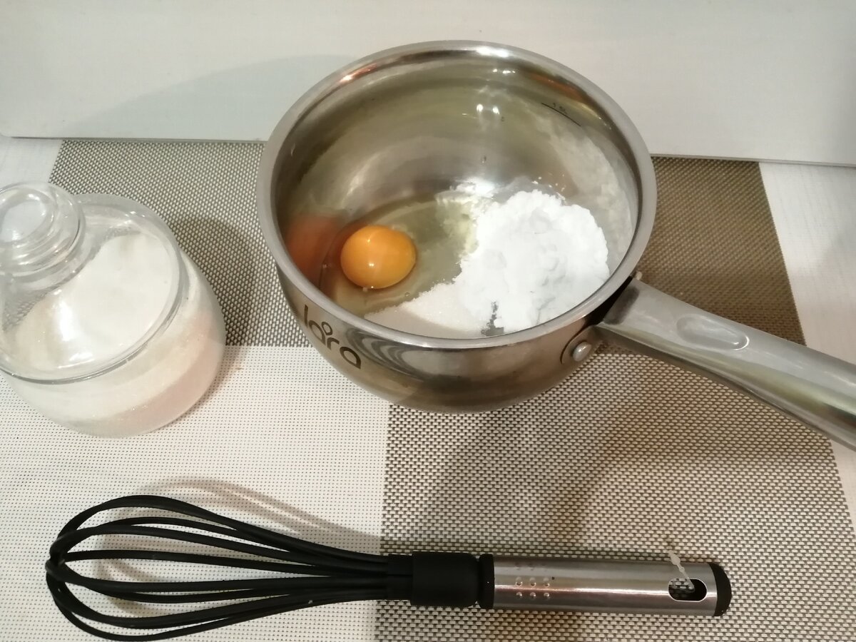 Начинаем с заварного крема: в одной миске смешиваем яйцо, сахар и крахмал. Затем аккуратно заливаем горячим молоком, постоянно помешивая, и ставим на плиту до загустения (1-2 минуты).