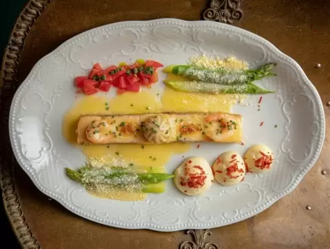 Сегодня в меню — изысканная форель, фаршированная нежным рыбным муссом и свежими овощами. Это кулинарное творение запекается под аппетитным раковым соусом, что добавляет ему уникального вкуса и аромата. К блюду предлагается гарнир из спаржи и креветок, а также пюре из сельдерея, которое идеально дополняет основное блюдо.