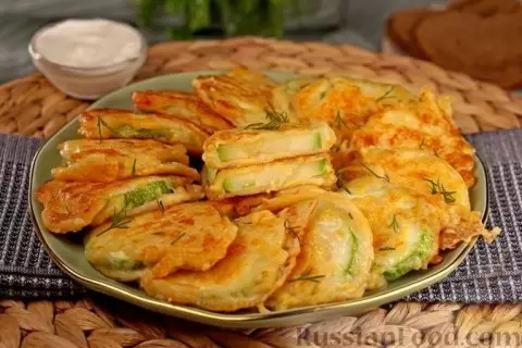 - Кабачки в кефирном кляре — обжаренные до золотистой корочки, эти кабачки получаются невероятно нежными благодаря кефиру и тертому сыру, которые придают блюду уникальный вкус.