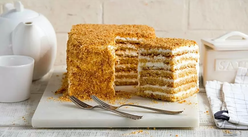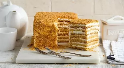 Этот медовик можно считать ленивым, хотя определенные усилия все же понадобятся. Однако рецепт, предложенный ниже, значительно упрощает процесс: вместо утомительной раскатки и выпекания отдельных коржей, тесто готовится в одном большом пласт, а затем разрезается на тонкие слои.