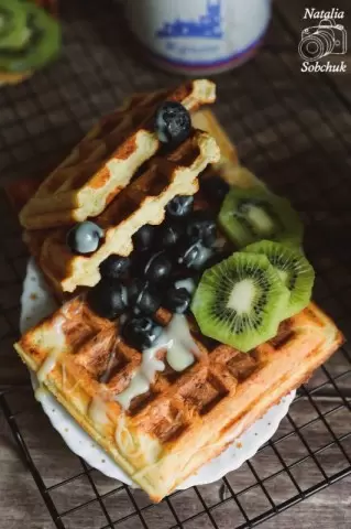 Нагрейте вафельницу или мультипекарь. Выложите по 1,5 столовые ложки теста и выпекайте вафли примерно 5-7 минут. Время выпечки может варьироваться в зависимости от вашей техники. Готовые вафли по желанию охладите на решетке и подавайте с ягодами, фруктами, карамелью или сгущённым молоком. Из предложенного количества теста получится 4 большие вафли или 6 маленьких.