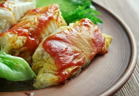- Заверните подготовленную начинку в капустные листья, складывая края внутрь. Разложите сформированные голубцы в жаропрочной форме, полейте томатным соусом и закройте фольгой.