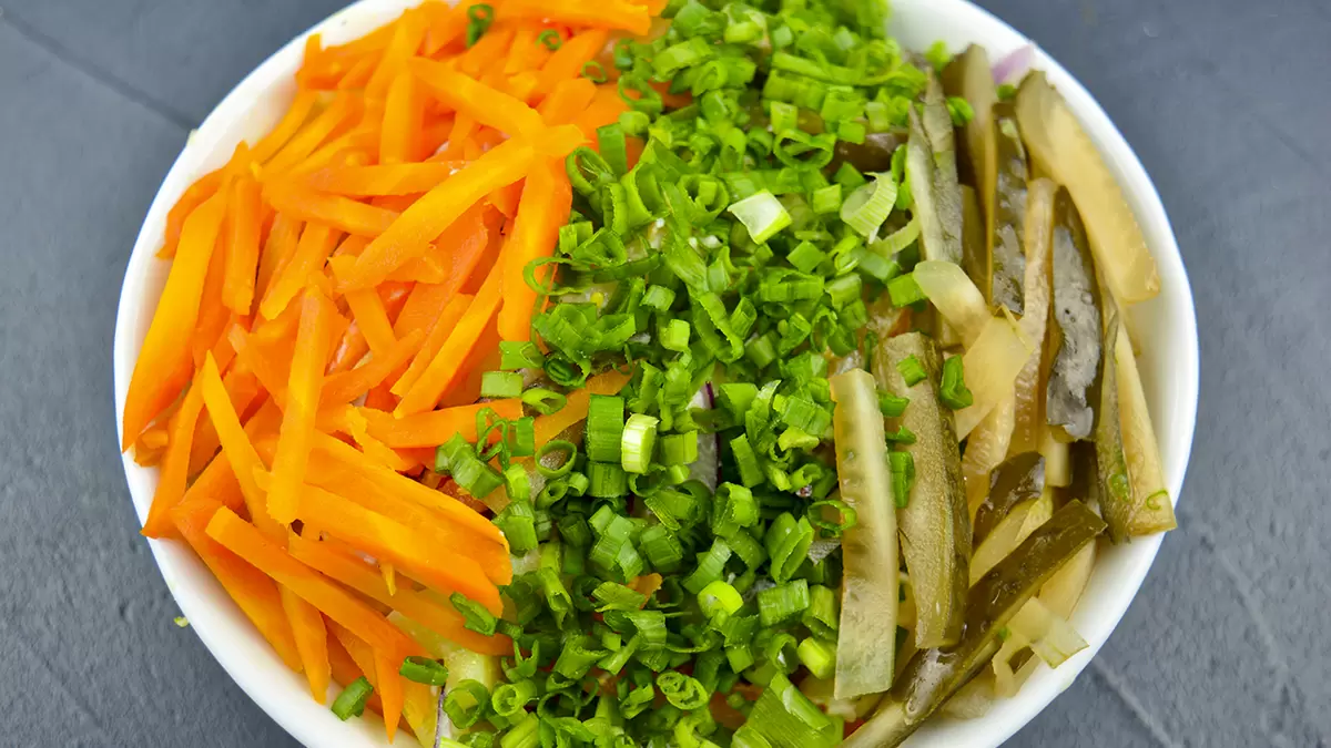 Не забудьте сварить и морковь: после варки она также очищается и нарезается соломкой. Вопрос на засыпку: знаете ли вы, как сохранить морковь плотной и вкусной при варке? Ожидаются ваши комментарии!