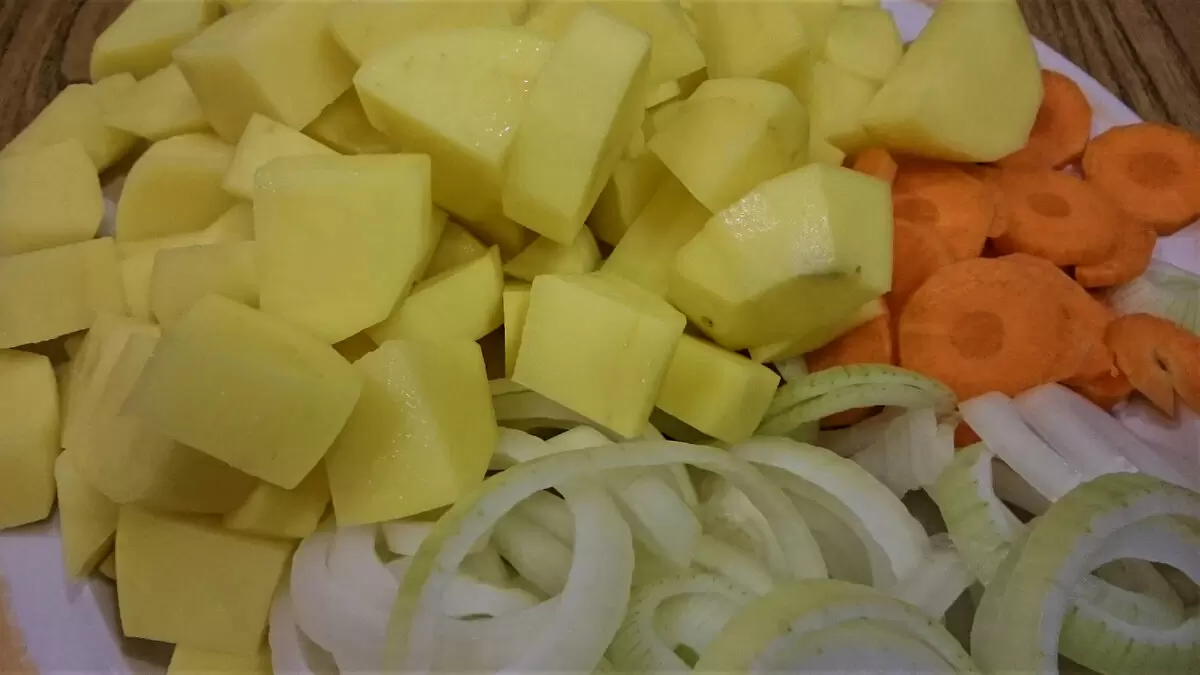 Ключевое отличие этого блюда от обычной тушеной картошки заключается в том, что все ингредиенты нужно предварительно обжарить. Это придаст жаркому особый вкус и аромат. Для начала следует подготовить овощи: нарезать лук и морковь кольцами, а картофель — кубиками средней величины.