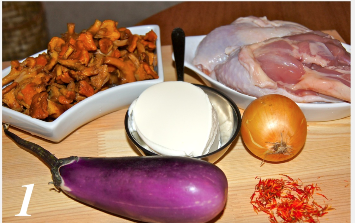 Чтобы приступить к приготовлению, мясо курицы и баклажан нарезают крупными кубиками, а лук измельчают, чтобы он гармонично вписался в текстуру блюда. Затем в сковороде разогревают сливочное масло и обжаривают курицу, баклажаны, лисички и лук до полуготовности на среднем огне. Можно добавить немного румяности, обжарив лук отдельно перед другими ингредиентами.