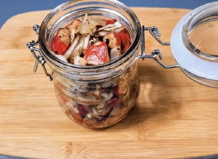 Чередуйте слои, пока не заполните банку до самого верха. Далее заливайте все маслом, добавьте уксус, соевый соус и приправы. Плотно закройте банку крышкой и оставьте в холодильнике на пару часов.