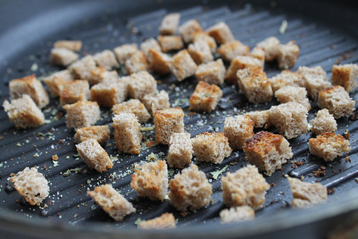 Первым делом стоит поджарить хлеб, нарезанный кубиками, на сухой сковороде до золотистой корочки. Это придаст салату хрустящую текстуру. Затем очищаем картофель и нарезаем его на мелкие кубики. Морковь и яйца также легко нарезаются с помощью яйцерезки, что позволит избежать излишних трудностей.