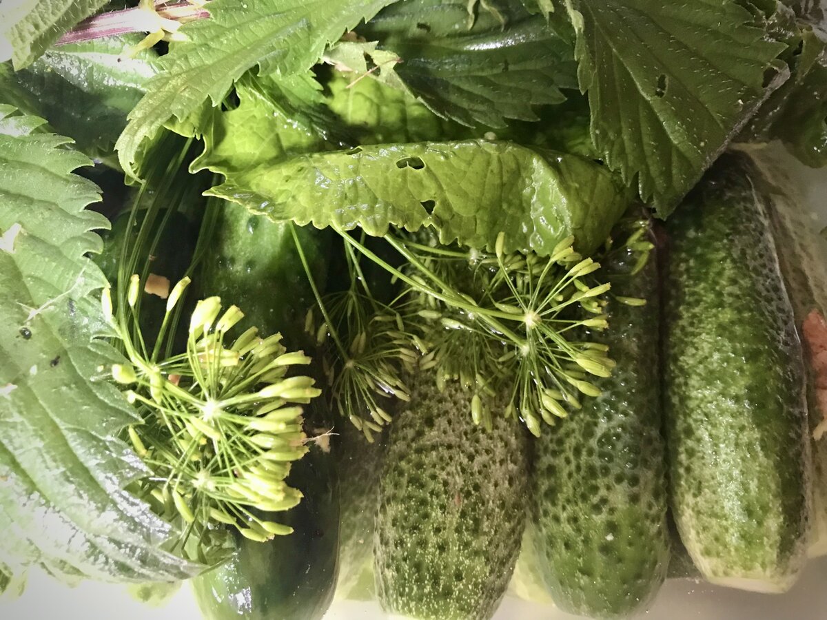 Процесс начинается с того, что необходимо хорошо помыть огурцы и срезать кончики с обеих сторон. Это позволит им быстрее просолиться. Затем, в выбранном контейнере, закладываются травы, а поверх них укладываются огурцы. Соль растворяется в воде и заливается в контейнер, после чего он накрывается листьями хрена и крапивой и оставляется на 12 часов при комнатной температуре, а затем на 12 часов в холодильнике. Позаботьтесь о том, чтобы огурцы были накрыты, это обеспечит равномерный процесс засола.