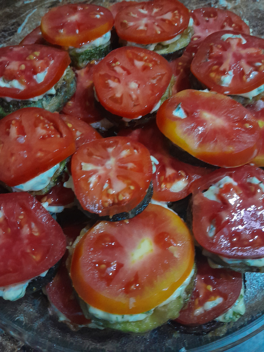 Соберите закуску: на каждый остывший баклажанный кружок равномерно намажьте соус и сверху положите дольку помидора. Лучше всего собрать закуску непосредственно перед подачей для сохранения свежести.