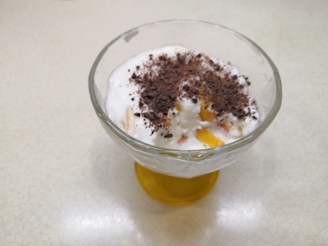 Подогреть желатин с водой в микроволновке (не доводить до кипения) и тщательно размешать до однородного состояния. Затем добавить подсластитель в йогурт и осторожно влить желатин. Для получения воздушной текстуры всё это можно немного взбить миксером. В завершение добавить порезанный персик и перемешать.