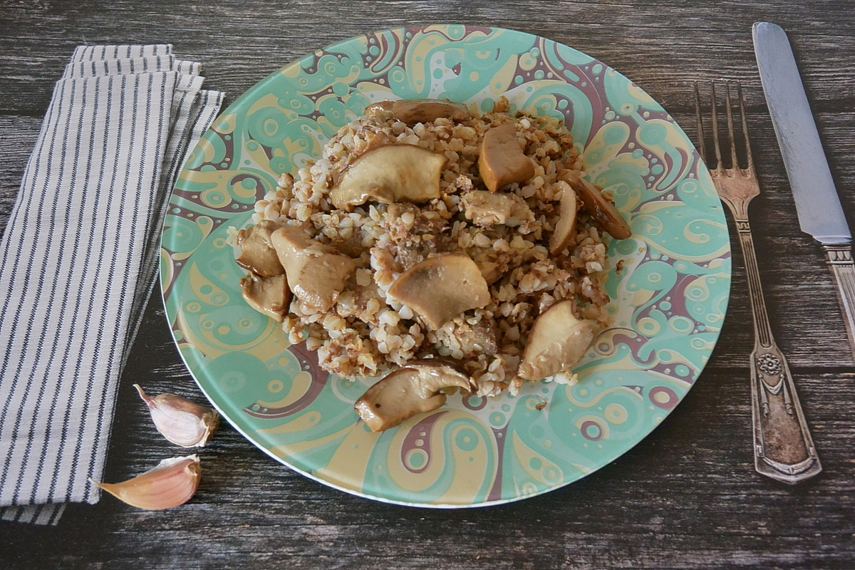 Дайте всем ингредиентам потушиться примерно 30 минут. В это время успеете отварить гречневую кашу по инструкции на упаковке. После того как каша готова, аккуратно смешайте её с обжаренной смесью грибов и овощей.