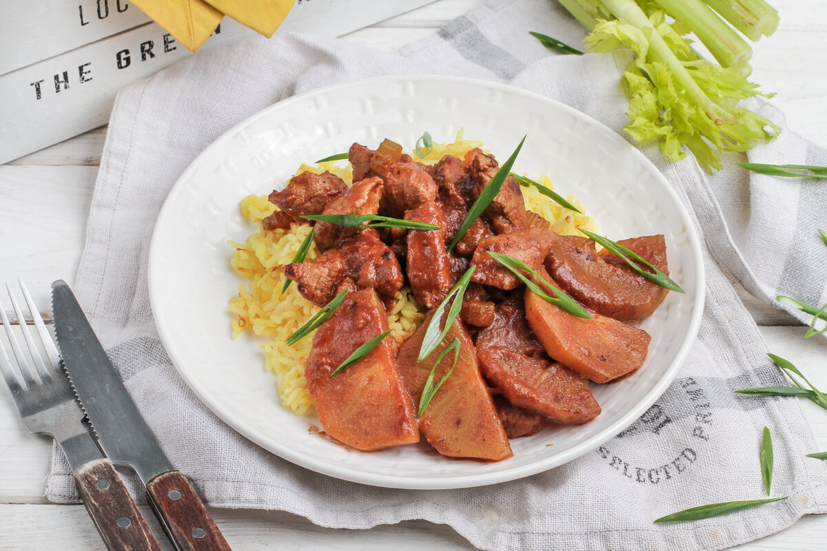 Хурму очистите и нарежьте полукольцами. Добавьте её к тушеному мясу, накройте крышкой и готовьте ещё 7 минут. Подавайте горячим вместе с рисом.