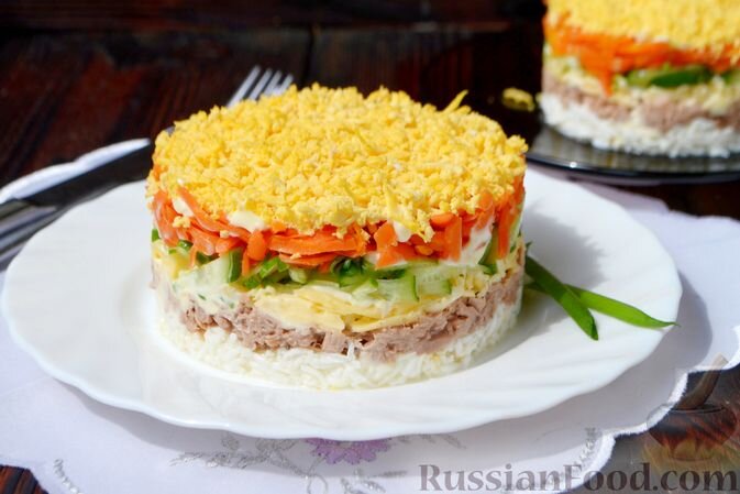 Примените кулинарные хитрости, чтобы создать слоеный салат с тунцом, морковью и сыром — все ингредиенты великолепно подчеркивают друг друга и создают уникальную палитру вкуса.