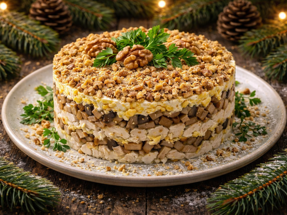 Планируя готовить нечто особенное, этот рецепт слоеного салата с куриной грудкой, шампиньонами и орехами — идеальный выбор. Сочетая любимые ингредиенты, он обязательно станет звездой стола. Хрустящие грецкие орехи придают блюду праздничный вид и оригинальный вкус, а сам процесс приготовления не займет много времени. Такой салат гарантированно станет любимцем на любом празднике.