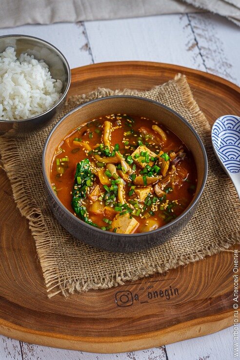 Как и наши щи, кимчи-тиге можно готовить с добавлением мяса или в вегетарианском варианте. В последнем случае блюда спасают грибы и тофу, которые делают суп не только сытным, но и полезным. Вегетарианский кимчи-тиге получается легким и необычным, а его приготовление занимает всего несколько минут.
