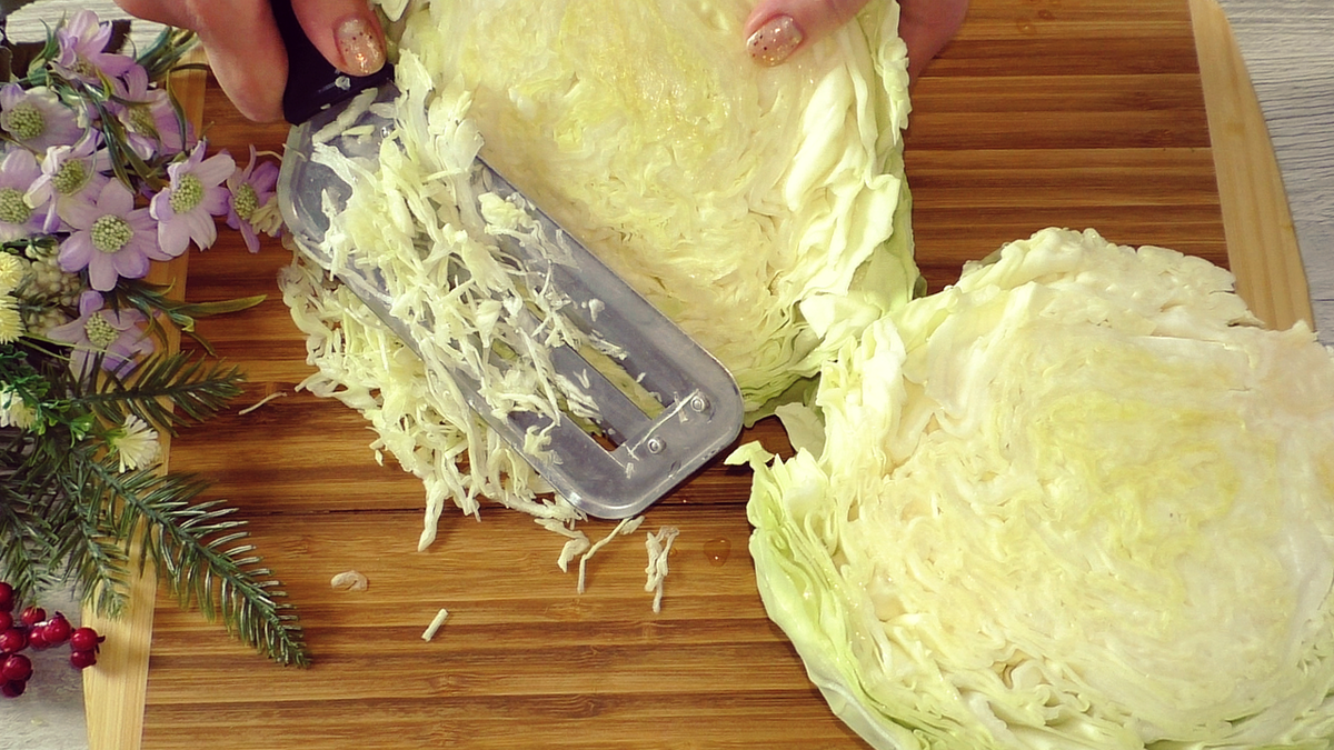 Первым делом, капусту нужно нарезать любым удобным способом. В это время воду необходимо довести до кипения. Мять капусту не нужно — лишний сок не требуется.