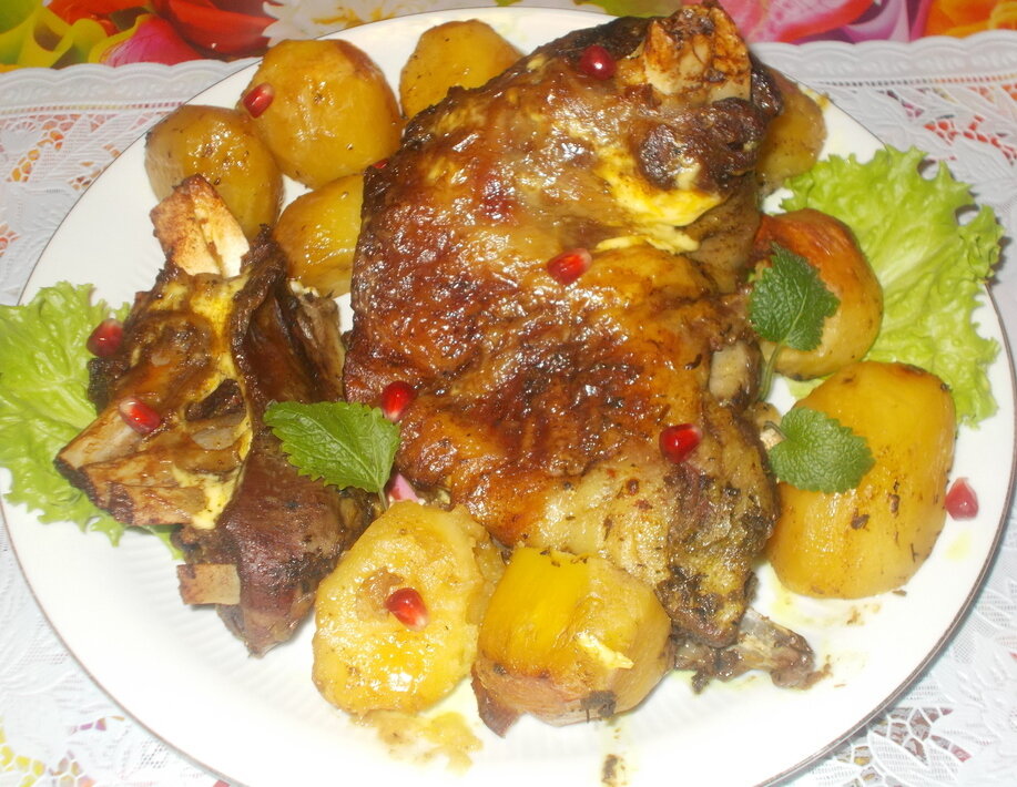 Для этого рецепта предлагается нога молодого барана, которая тщательно маринуется в яблочном уксусе и томатном соусе с добавлением ароматных специй.