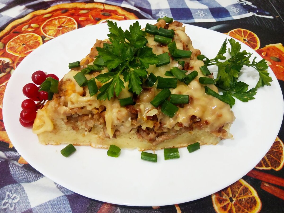 Как только сыр расплавится, пирог можно выложить на тарелку и посыпать зеленью.