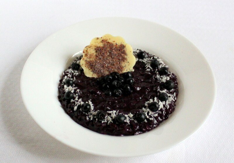 На водяной бане растопить половину белого шоколада. Разлить его по дну двух силиконовых форм для маффинов, посыпать 1 столовой ложкой цветочного сахара и убрать в морозильник до застывания.Отложить 1/4 стакана черники для украшения, а оставшуюся часть измельчить блендером в пюре.В кастрюле налить кокосовое молоко, добавить цедру лайма и подогреть на среднем огне, не доводя до кипения.В сковороде растопить сливочное масло и обжарить рис до прозрачности. Затем влить вино, дождавшись его испарения. По одному половнику добавлять кокосовое молоко, каждый раз дожидаясь впитывания предыдущей порции. Спустя 15 минут, добавить сахар и черничное пюре, перемешать. Проверьте готовность риса через 2 минуты: идеальное состояние – аль денте. Снять с огня, добавить натертый оставшийся шоколад, накрыть крышкой и оставить настояться.При подаче разложить ризотто по тарелкам, украсить кокосовой стружкой и оставшимся цветочным сахаром. В центре каждый порции разместить отложенную чернику и украсить шоколадными дисками, начиная с формочек.