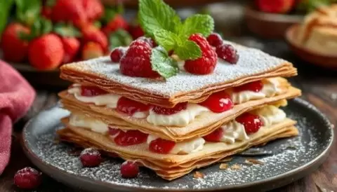 Мильфей, элегантный французский десерт, представляет собой кулинарное произведение искусства. Этот изыскавший слоеный пирог состоит из нескольких слоев хрустящего теста, чередующихся с нежным заварным кремом, который может быть дополнен фруктами или ягодами. Такое сочетание текстур и вкусов делает мильфей настоящим гастрономическим наслаждением, где хрустящее тесто гармонично сочетается с мягким кремом.