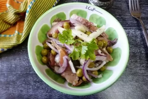 - Консервированный горошек — 4-5 ст. ложек