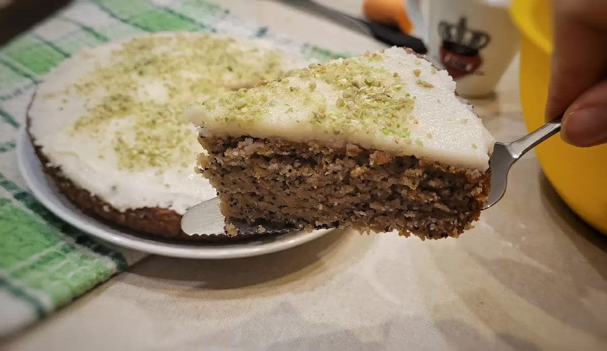 После выпекания кекс должен остыть. По желанию его можно украсить: отличным вариантом станет смесь кокосового урбеча с сиропом топинамбура и дробленые фисташки для текстурного контраста. Готовый кекс порадует не только глаз, но и вкус!