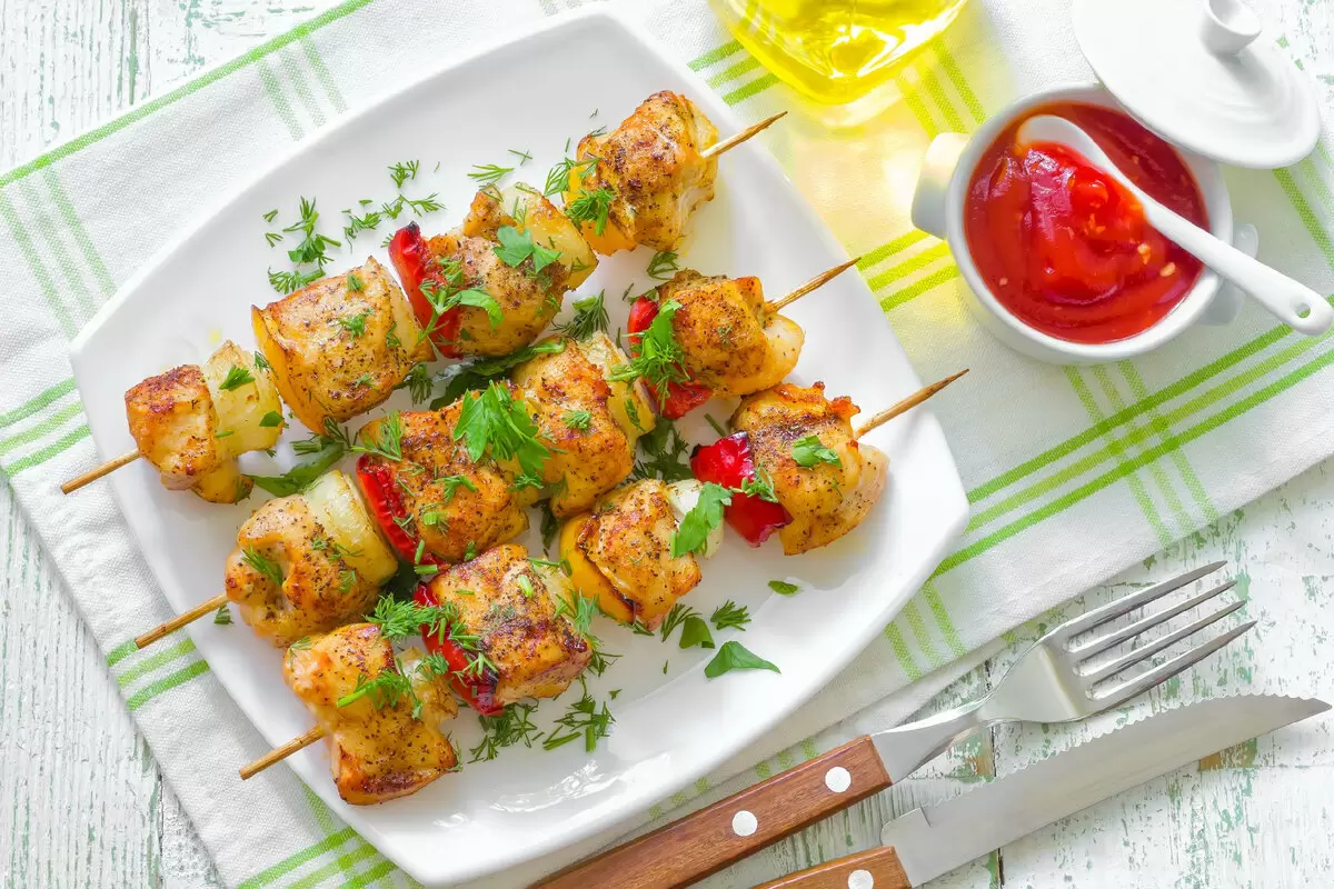 Шашлыки подойдут с гарниром из свежих овощей, зелени или запеченного картофеля. Не забудьте про соусы и заправки по вашему выбору!