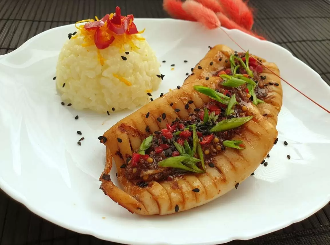 Подготовьте сковороду, смазав ее растительным маслом, и разогрейте до появления легкого дыма. Присыпьте кальмары надрезами вверх и обжаривайте в течение 1,5 минут. Затем аккуратно переверните их и продолжайте жарить еще 1 минуту. Готовые кальмары выложите на тарелку и украсьте оставшимся соусом. Для дополнительного вкуса добавьте кунжут, нарезанный перец чили и зеленый лук. Это блюдо прекрасно сочетается с апельсиновым рисом.
