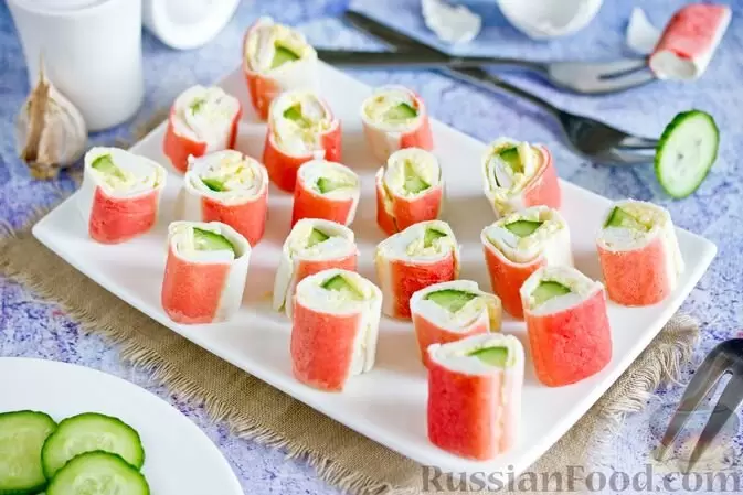 Также попробуйте завернуть крабовые палочки с начинкой из сыра, яиц и чеснока с добавлением кусочков свежего огурца. Эта закуска станет настоящим хитом на вашем столе.