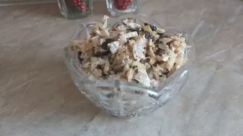 Завершив приготовление, выложите салат в хрустальную вазочку, что придаст ему особую изысканность и шарм. Порадуйте своих близких и сделайте каждый прием пищи праздником!
