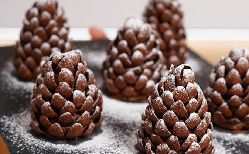 Как только бисквит готов, можно переходить к декорированию. Каждый конус легко обвалять в какао-порошке, чтобы подчеркнуть цвет шишки. Потом с помощью шоколадных кукурузных хлопьев создайте «лепестки», аккуратно наклеивая их на конус. Завершите процесс, присыпав сахарной пудрой сверху — так создается эффект свежевыпавшего снега.