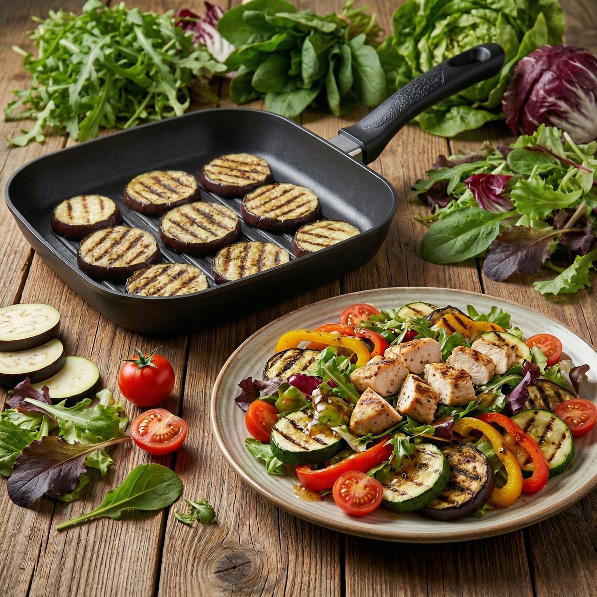 Этот яркий и полезный салат удивит вас своим великолепным вкусом и легкостью. Ароматная курица, обжаренные на гриле овощи и ароматная зелень — идеальное сочетание для насыщенного обеда.