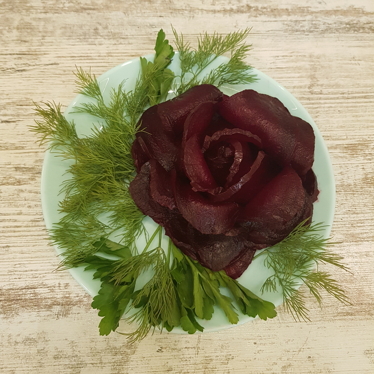 Основа проста: сваренная или запечённая свекла, стакан и зелень укропа с петрушкой. Лепестки формируются по принципу progressively уменьшающихся кругов: тонкие кружки укладываются у края стакана, затем — более крупные, пока центр не завершится половинкой круга.